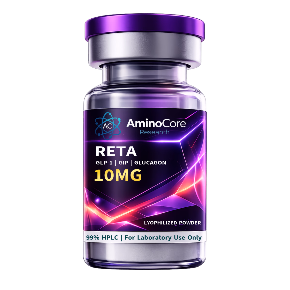 Retatrutide is available in 10mg, 20mg, 30mg, 40mg, and 60mg lyophilized vials. All sizes are manufactured to ≥98% HPLC-verified purity with a Certificate of Analysis (COA) included. The fatty acid conjugation provides a ~6-day half-life enabling once-weekly research protocols.
